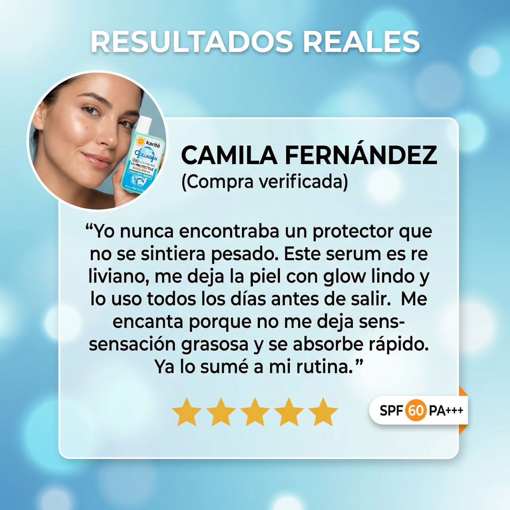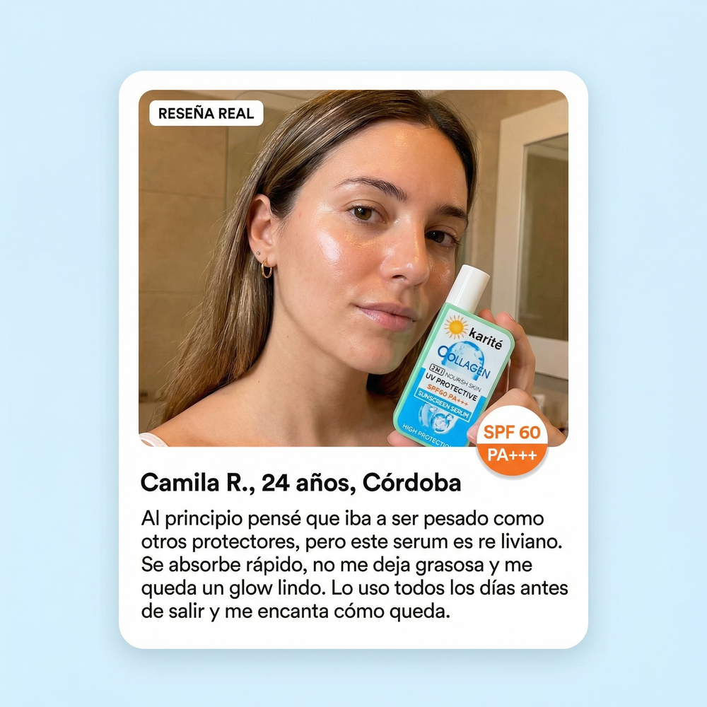 “Al principio pensé que iba a ser pesado como otros protectores, pero este serum es re liviano. Se absorbe rápido, no me deja grasosa y me queda un glow lindo. Lo uso todos los días antes de salir y me encanta cómo queda.”