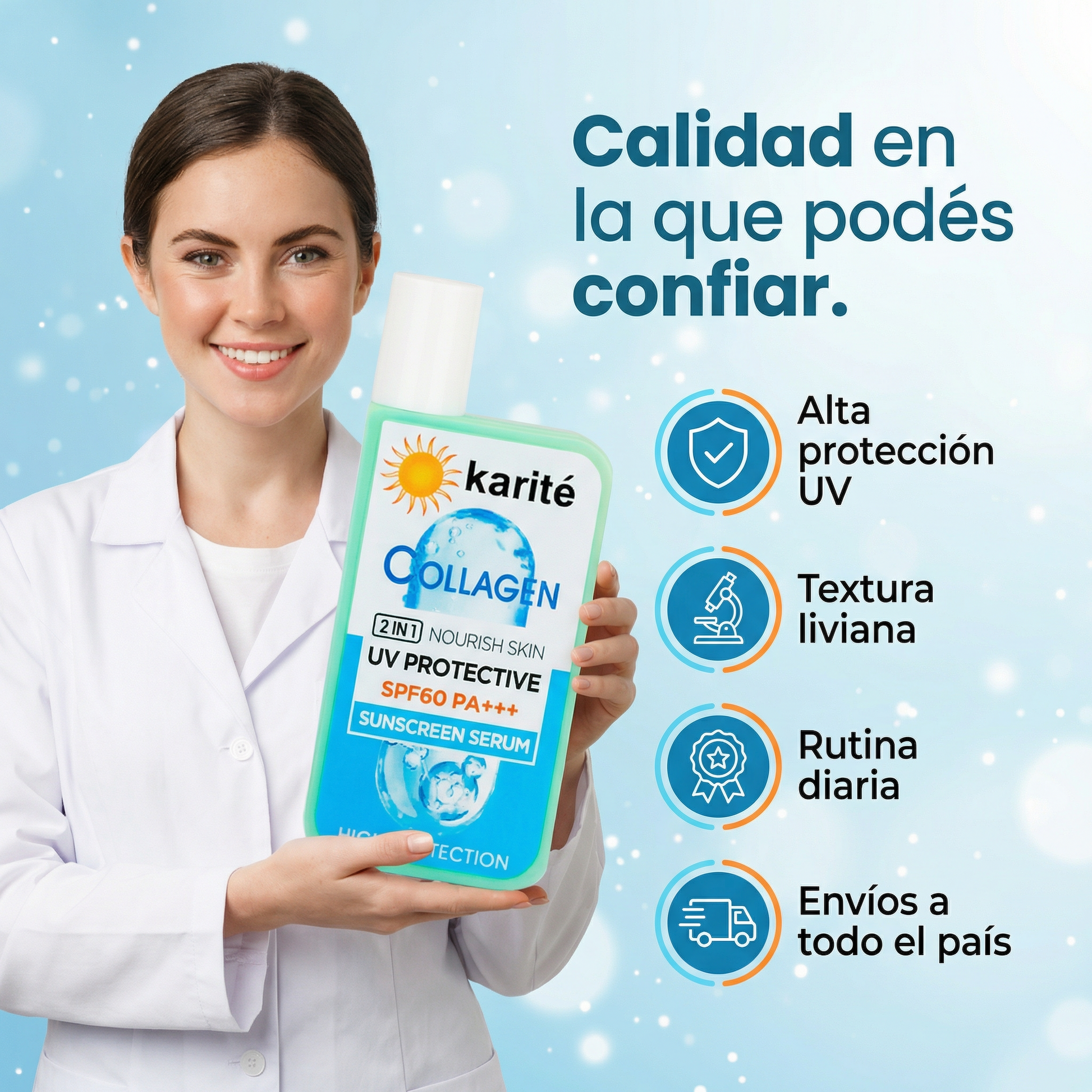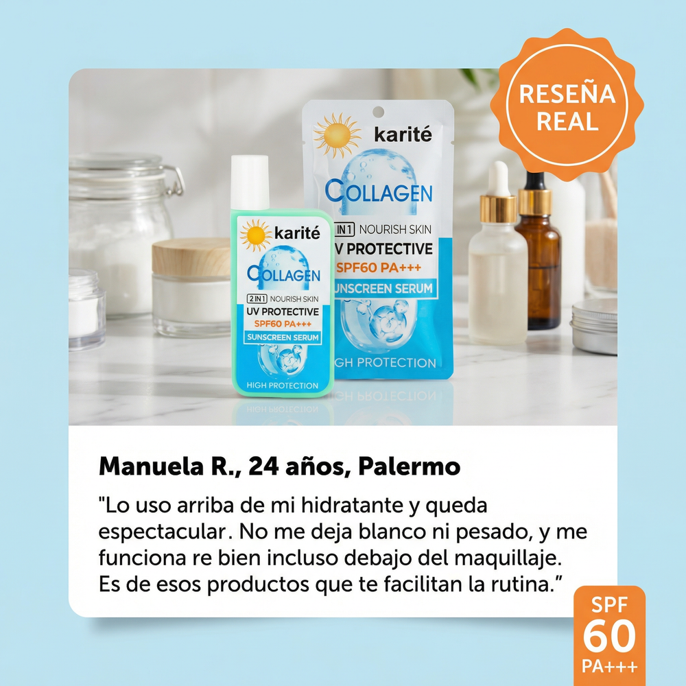 Karité Collagen Sunscreen Serum SPF60 PA+++ combina filtros solares UV con una base tipo sérum pensada para el uso diario, aportando una sensación liviana y confortable en la piel.