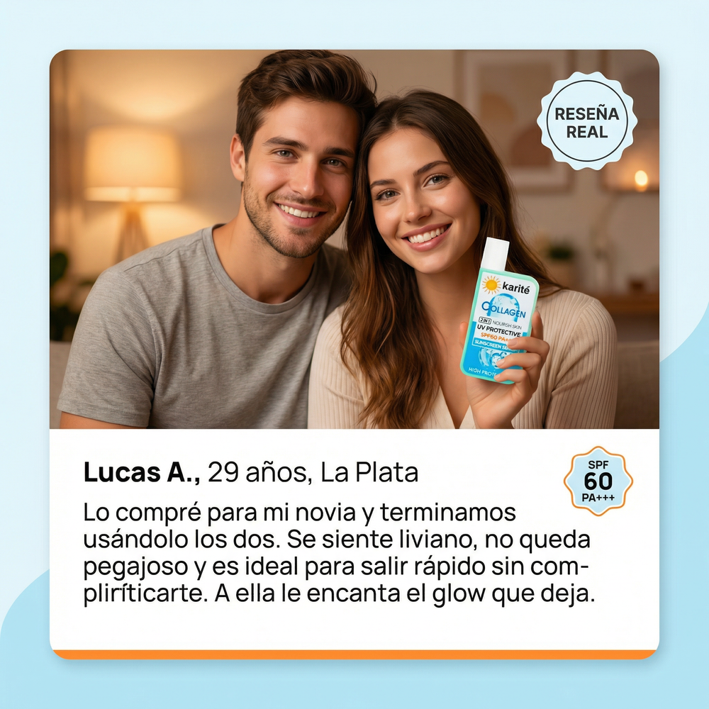 “Lo compré para mi novia y terminamos usándolo los dos. Se siente liviano, no queda pegajoso y es ideal para salir rápido sin complicarte. A ella le encanta el glow que deja.”